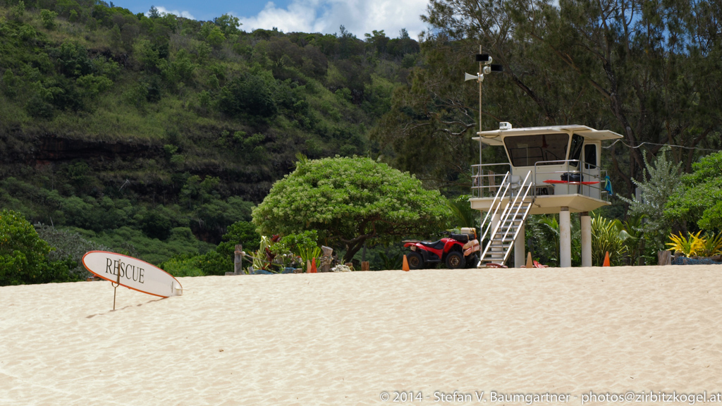 Rettungsschwimmerturm an der Waimea Bay, Oahu, Hawaii, USA