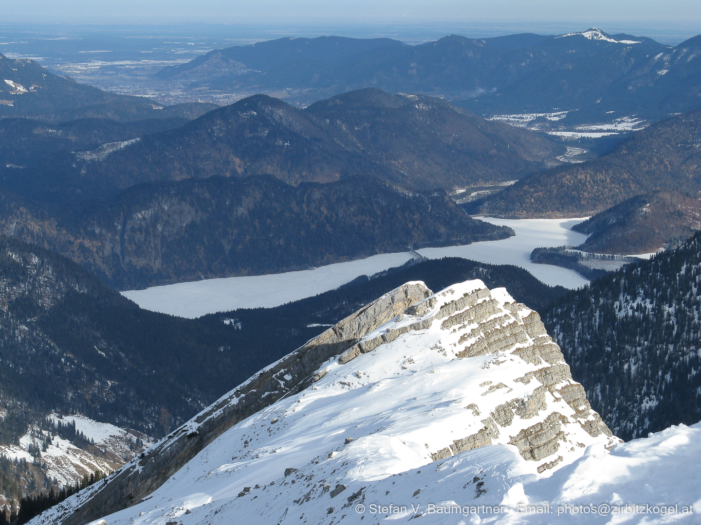 Am Gipfel des Schafreuter mit Blick hinunter zum zugefrohrenen Sylvensteinsee, Tirol, Österreich