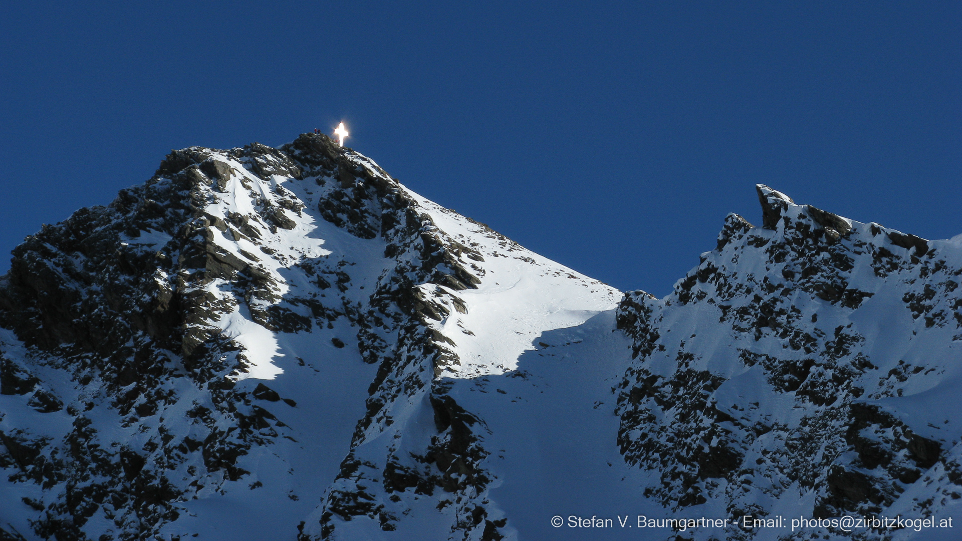 Mystische Sonnenreflexion an einem Gipfelkreuz bei der Abfahrt vom Schartenkopf, Sellrain, Tirol, Österreich