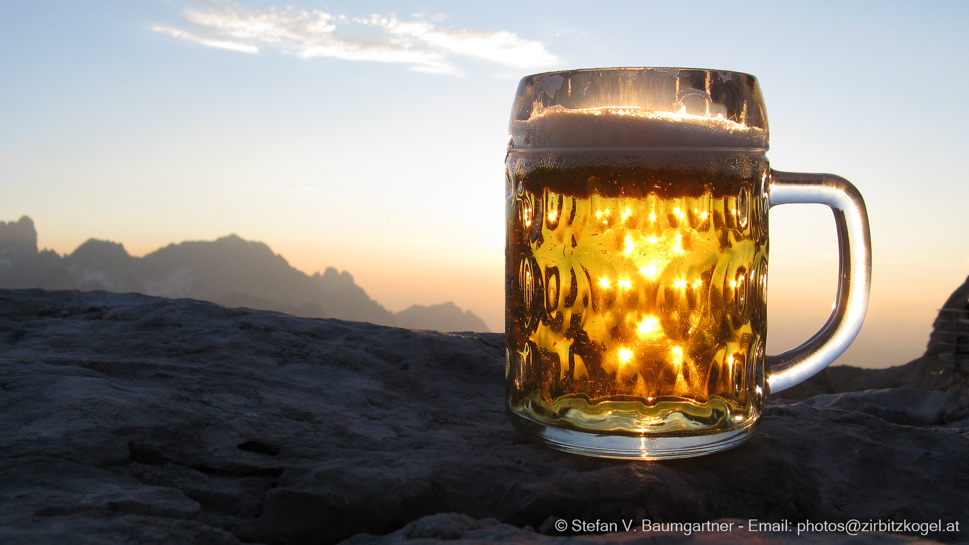 Eine Maß Bier bei Sonnenuntergang an der Adamek-Hütte, Dachstein, Österreich
