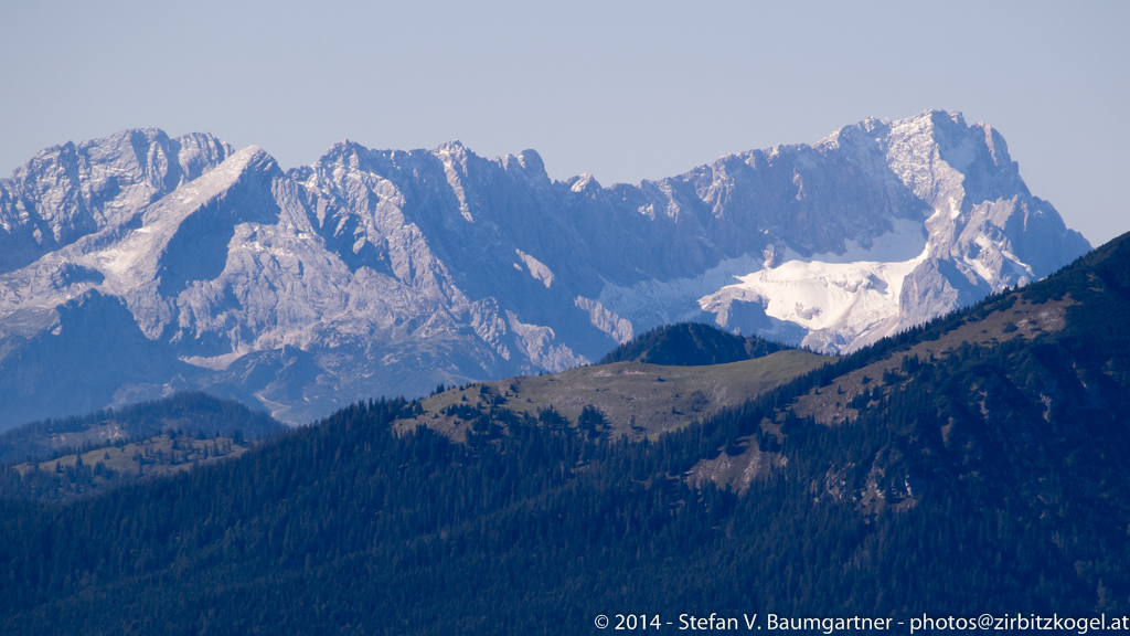 Zugspitze (rechts) mit Jubiläumsgrat (Mitte) und Alpspitze (links), Bayern, Deutschland