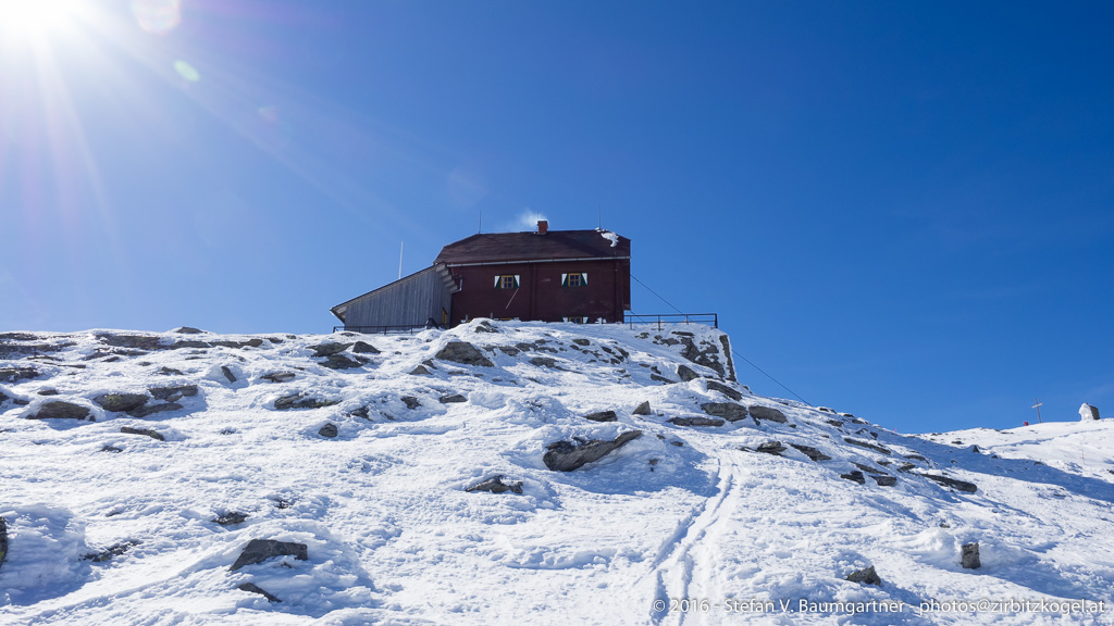Zirbitzkogel-Schutzhaus (2376 m) des ÖTK (Österreichischer Touristenklub, www.oetk.at) beim Aufstieg über den Nordost-Hang