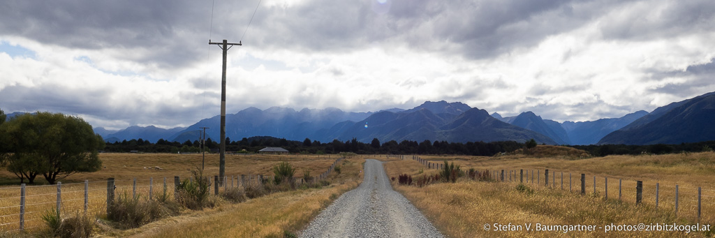 Seitenstraße und Berge in der Nähe des Manapouri-Te Anau Highway