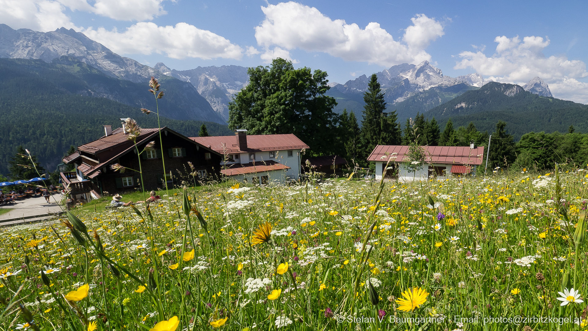 Berggasthof Eckbauer mit Mieminger Gebirge und Wettersteingebirge im Hintergrund