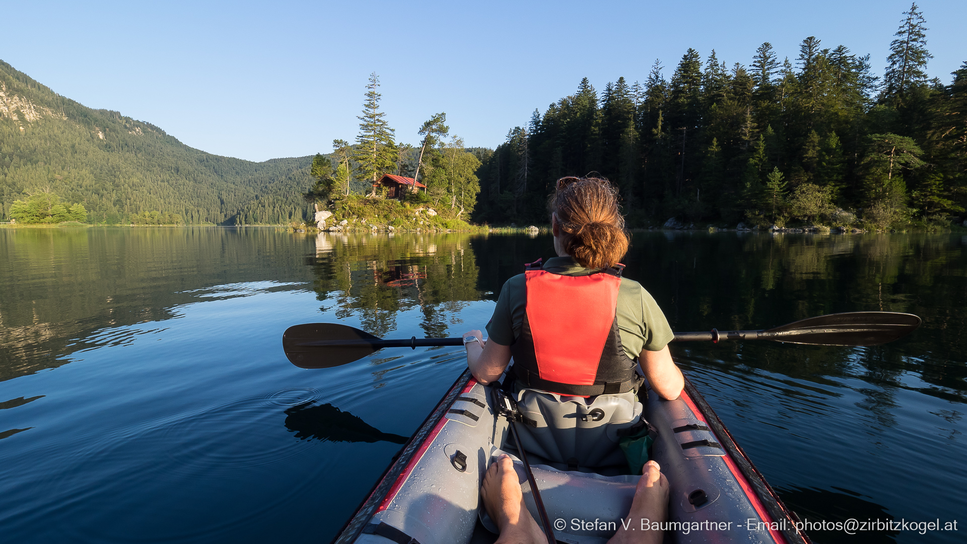 Mit dem Kajak kurz nach Sonnenaufgang unterwegs am Eibsee, Bayern, Deutschland