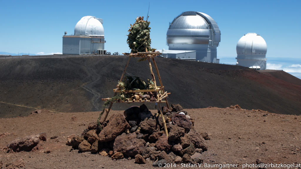 Gipfel des Mauna Kea (4214 m) mit University of Hawai'i 2.2-m Telescope, Gemini Northern Telescope und Canada-France-Hawaii Telescope (CFHT) im Hintergrund, Big Island, Hawaii, USA