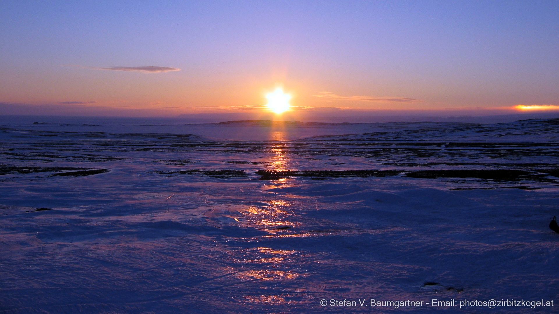 Sonnenuntergang über dem Wahlenbergfjorden in Oxfordhalvøya, Nordaustlandet, Svalbard