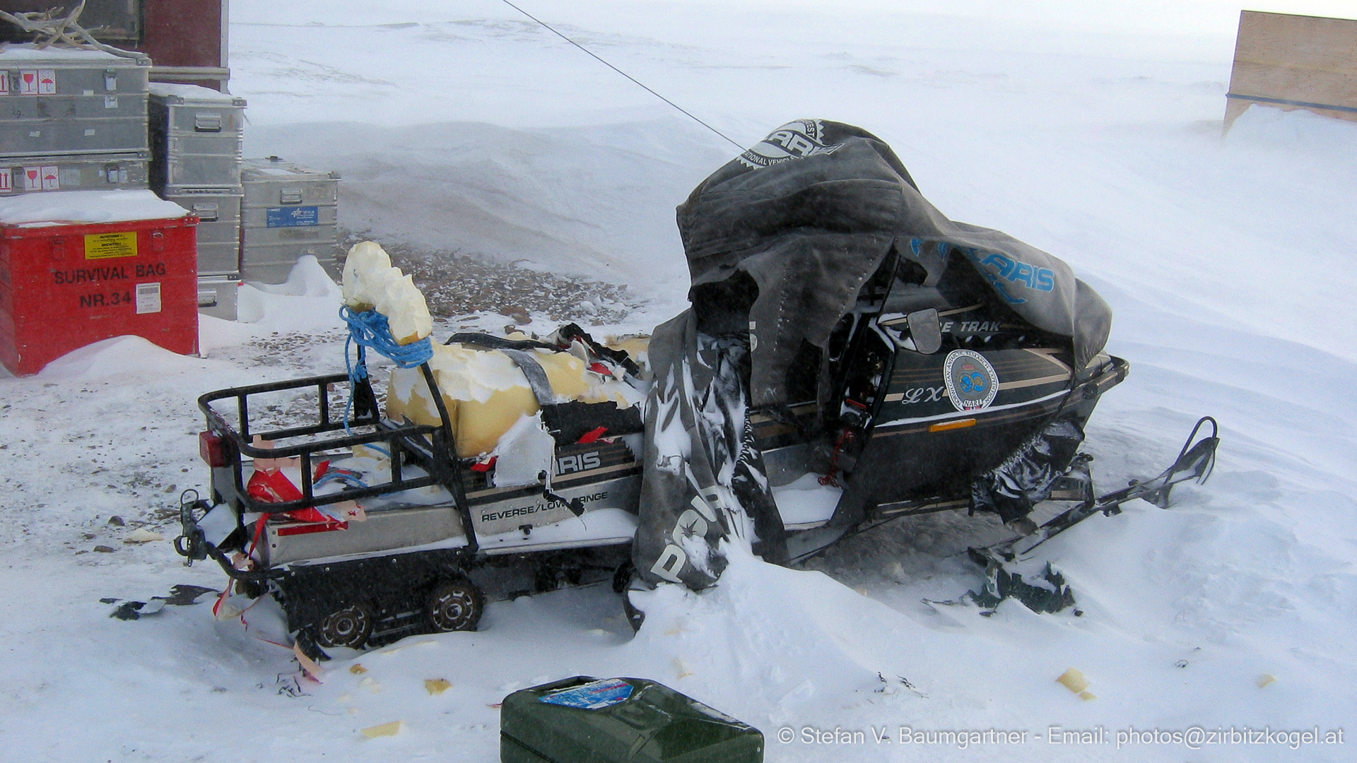 Schneemobil nach einer Eisbärenattacke, Oxfordhalvøya, Nordaustlandet, Svalbard
