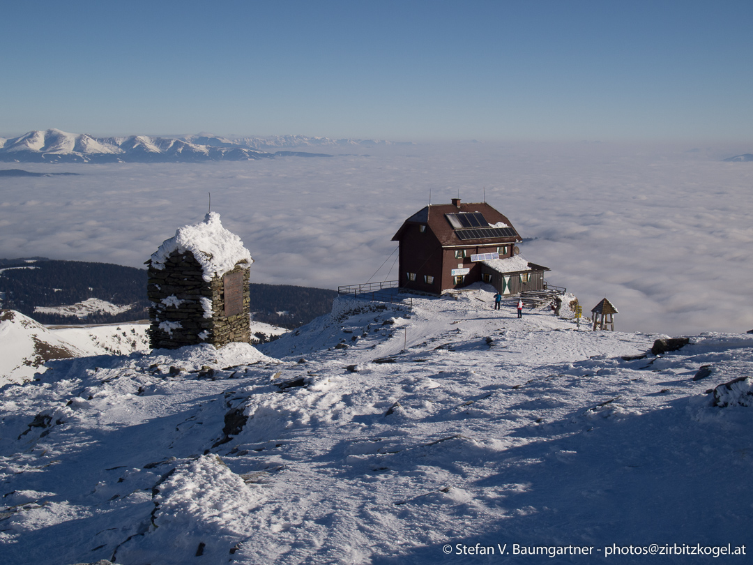 Kurz unterhalb des Gipfels des Zirbitzkogels mit dem Blick auf das Materl und das Zirbitzkogel-Schutzhaus des ÖTK (Österreichischer Touristenklub, www.oetk.at). Links im Hintergrund ragt der Seckauer Zinken aus dem Nebelmeer hervor.