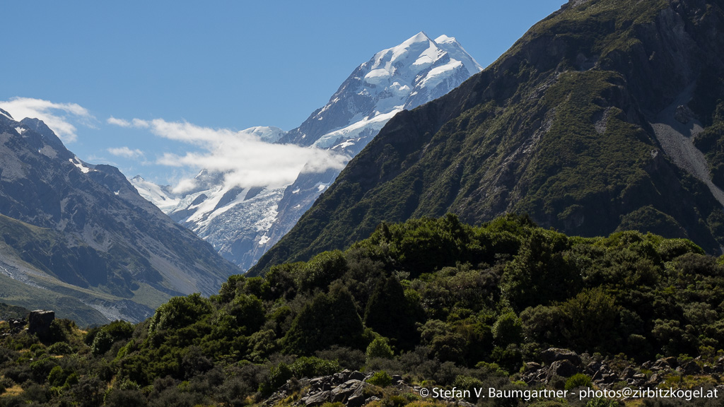 Mount Cook (3724 m), aufgenommen auf knapp 780 m Seehöhe am Hooker Valley Track