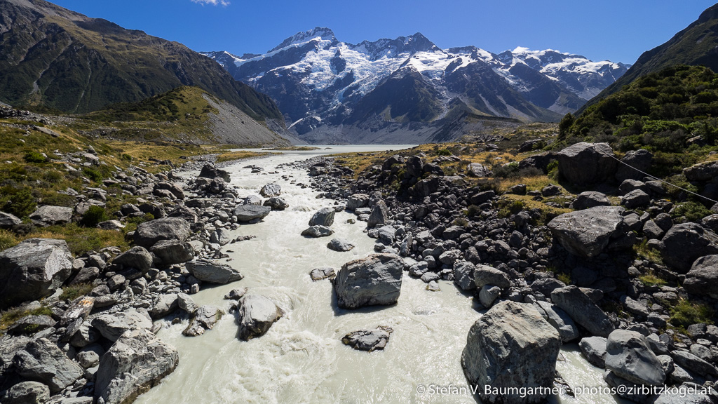 Hooker River mit Mueller Lake und Mount Sefton (3151 m) im Hintergrund