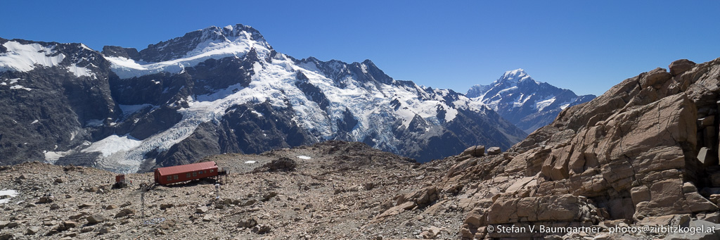 Mueller Hut (1800 m) mit Mount Sefton (3151 m, links der Bildmitte) und Mount Cook (3724 m, rechts)
