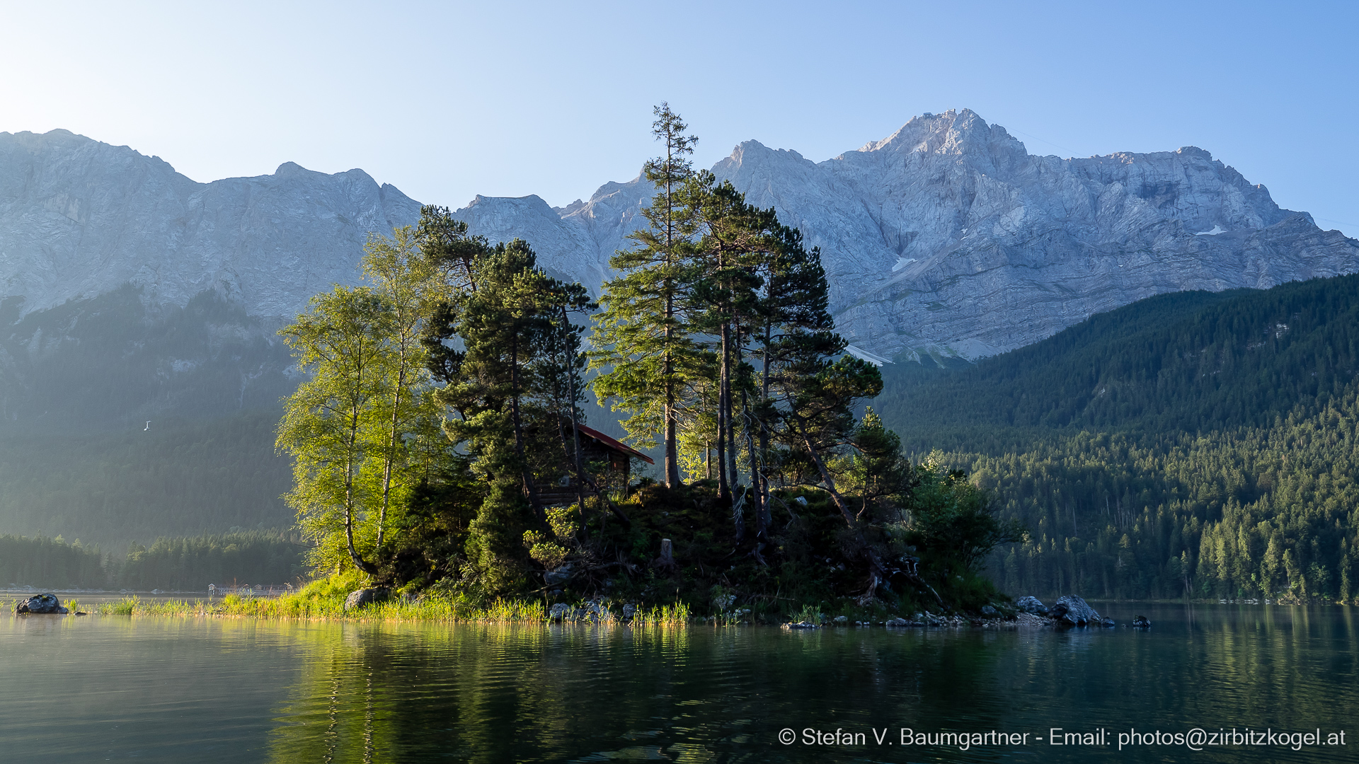 Insel Schönbichl im Eibsee (973 m) kurz nach Sonnenaufgang. Im Hintergrund rechts der Bildmitte befindet sich die 2962 m hohe Zugspitze, der höchste Berg Deutschlands.